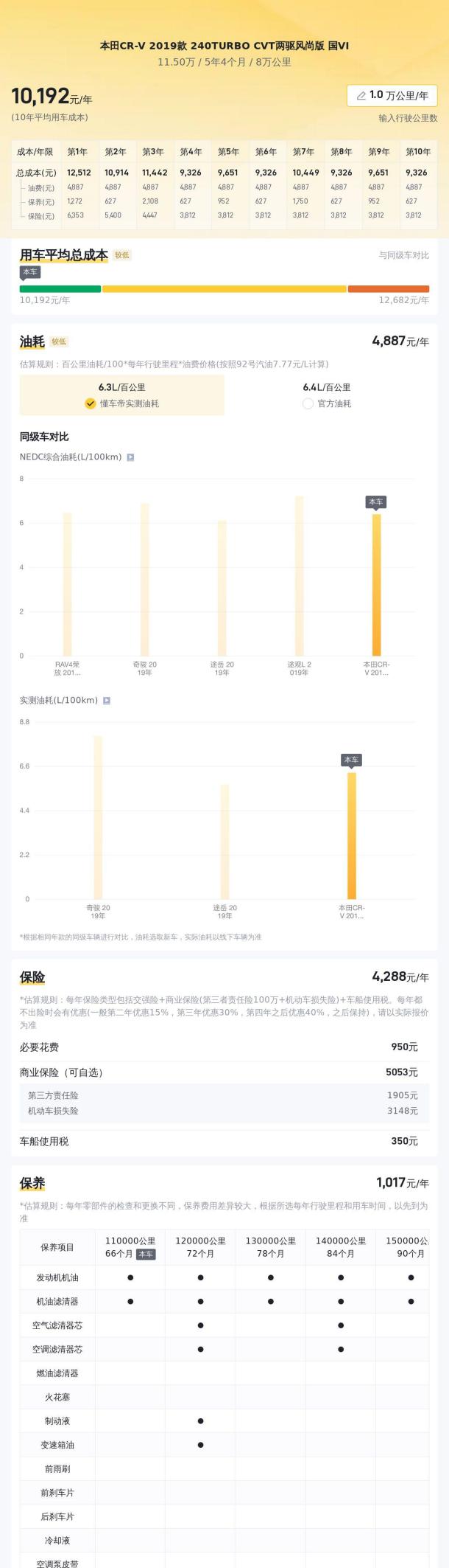 说到用车成本,根据估算,CR-V的年均用车成本大约在10377元左右,处于同级别车型的中等水平。这个数字包括了燃油费、保险费、保养费等各项支出,具体金额会根据个人用车情况而有所差异。