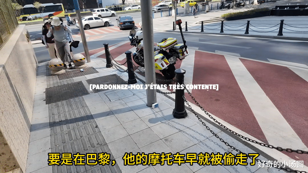 一转眼,路边又看到了一辆停着的巡警摩托车,然而巡警并不在周围,其中一位小姐姐自嘲道:“要是在巴黎,他的摩托车早就被偷走了”