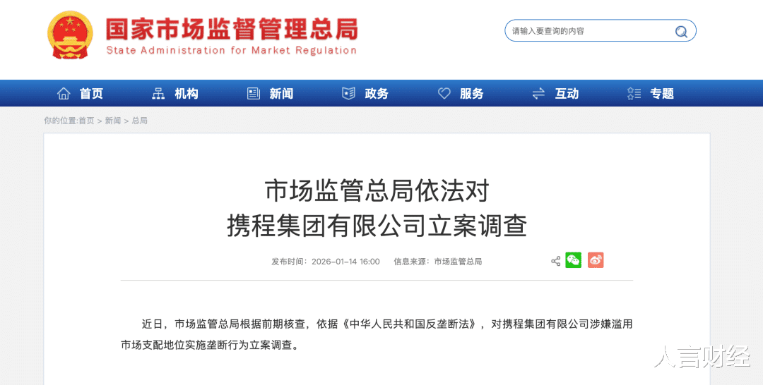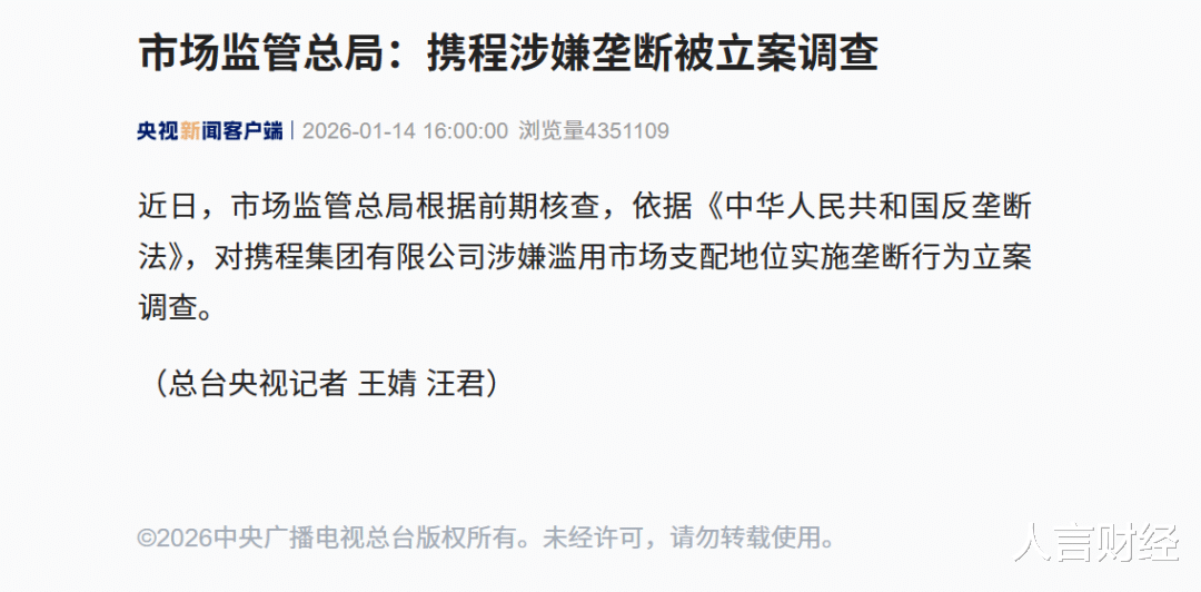 最终,国家市场监管总局在2026年1月14日正式宣布对携程立案调查,这一记重拳终于打在了携程的痛处。