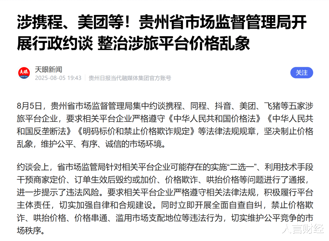2025年8月,贵州省市场监督管理局率先出手,集中约谈携程等五家涉旅平台,明确指出存在"二选一"、利用技术手段干预商家定价、价格欺诈等问题。