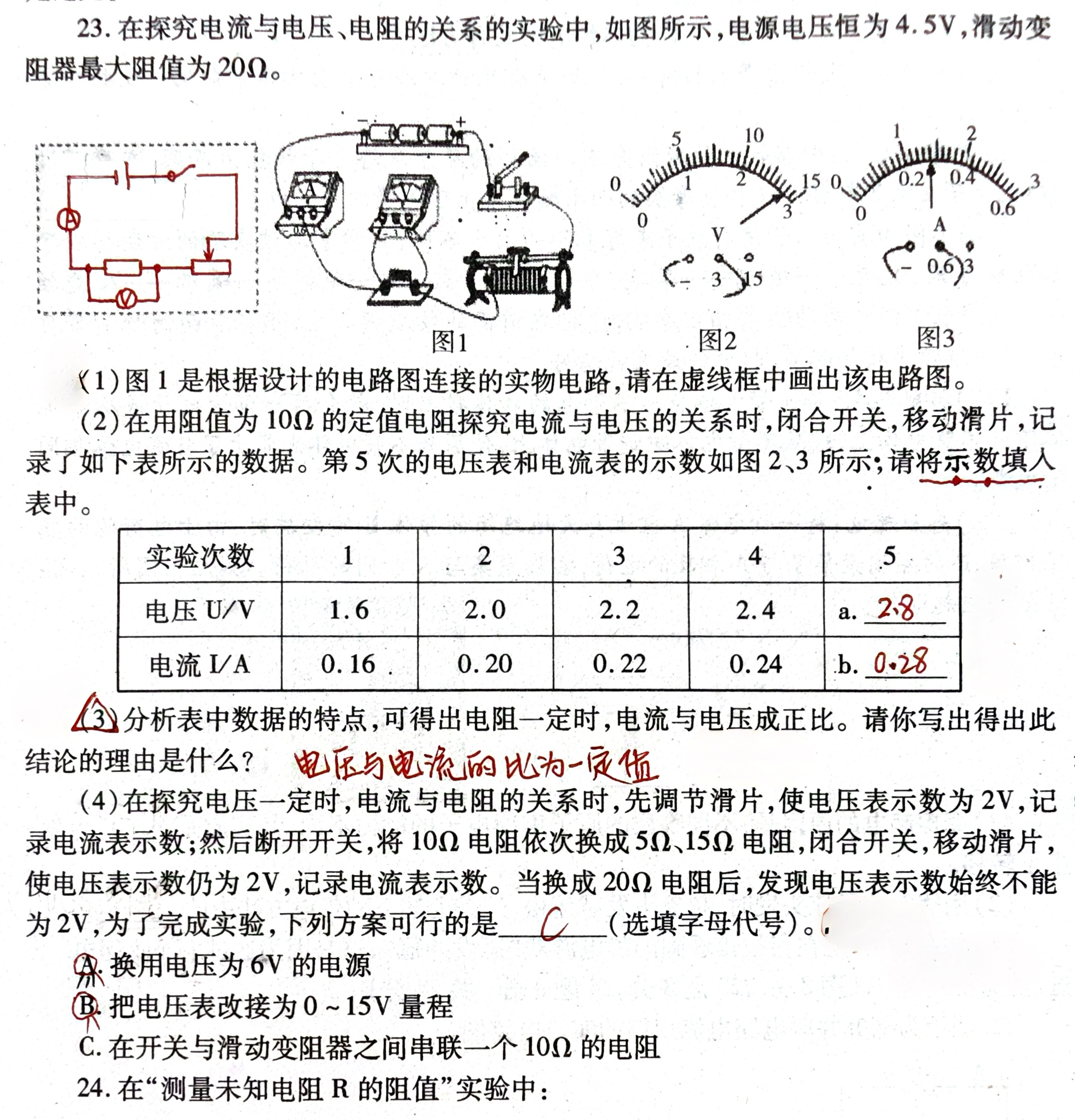 需要注意的是(2)竟然有些学生填入了2.6,0.26,这一点很让人意想不到,两个电表的示数非常明显,即便分度值弄错,也不至于读出这俩数!后来询问得知,这部分学生竟然不是读出电表示数,而是根据表格,推理出的数据,他们觉得表格中的相邻两组数据之差分别为0.2和0.02,于是得出了这两个错误数据!他们竟然在审题时没有细看也没有细想图2图3的存在价值!真是令人意外且遗憾!
