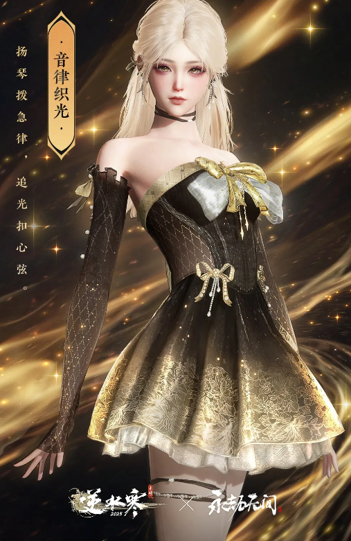 比如女款【音律织光】的袖口藏着小心机,长手套与礼服裙的碰撞,非但不违和,反而多了几分复古优雅。搭配的天赏发型【琴心】更是绝了——浅金长发扎成公主头,黑色蝴蝶结与裙摆呼应。这发型一戴,相信你的男神看了直接心跳暴击哦~