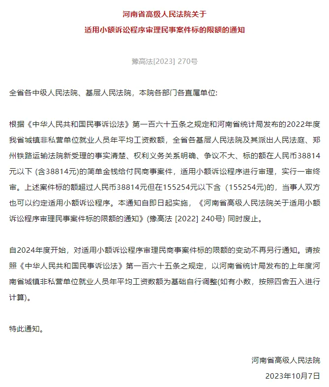 一、这应该是一起“一审终审”的小额诉讼程序案件,故没有看到案件上诉的信息根据最新的河南省高院发布信息,全省各基层人民法院及其派出人民法庭,对于事实清楚、权利义务关系明确、争议不大、标的额在人民币38814元以下 (含38814元)的简单金钱给付民商事案件,适用小额诉讼程序进行审理,实行一审终审。