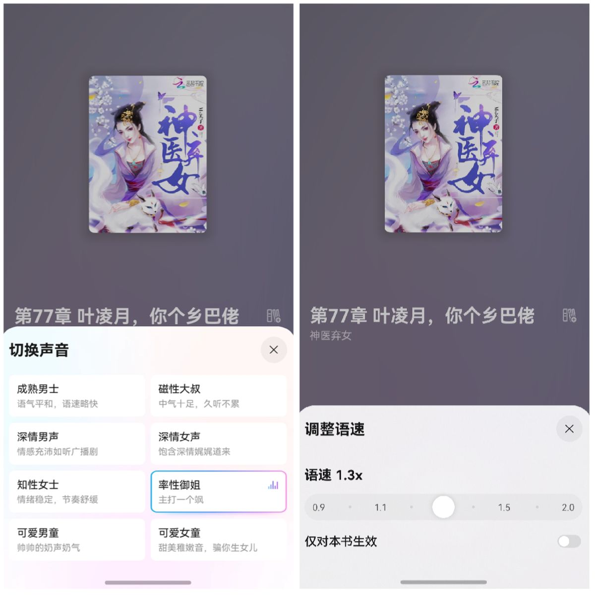 “小说”频道里无论是霸总逆袭还是玄幻修仙,各种题材管够!“随心听”模式下还有8款专业音色可以选择,调个1.3倍速,闭上眼听着爽文,几个小时的车程一晃就过去了。