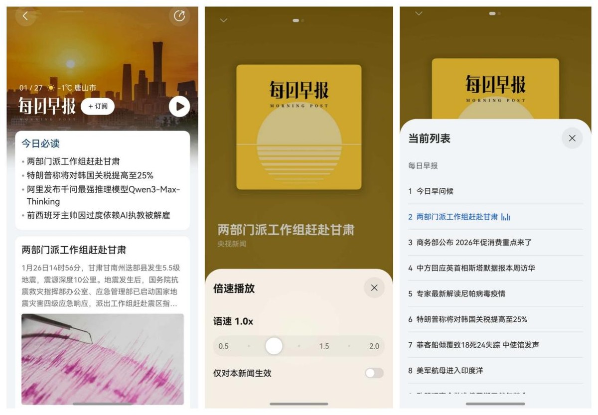 除此之外,我还有一个私藏的小习惯——“听早报”。早晨在赶往车站的路上,或者在春运途中闭目养神时,我都会先点开“早报”频道,点击播放键,了解一下最新的全球热点。它的声音特别自然,不像那种生硬的机器音,还能根据兴趣定制本地资讯,这种解放双手的快乐谁用谁知道!