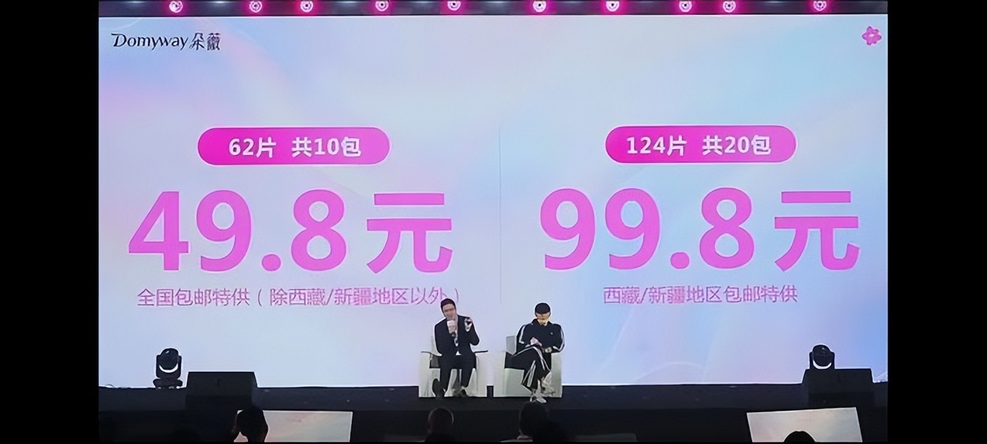 04说回产品,价格也是现场公布的:62片49.8元,124片99.8元。还贴心地考虑到西藏、新疆的物流成本问题,价格是全国包邮特供,真的是有在认真做生意。产品组合也很全:迷你巾、日用、夜用、还有安心裤,照顾得明明白白。