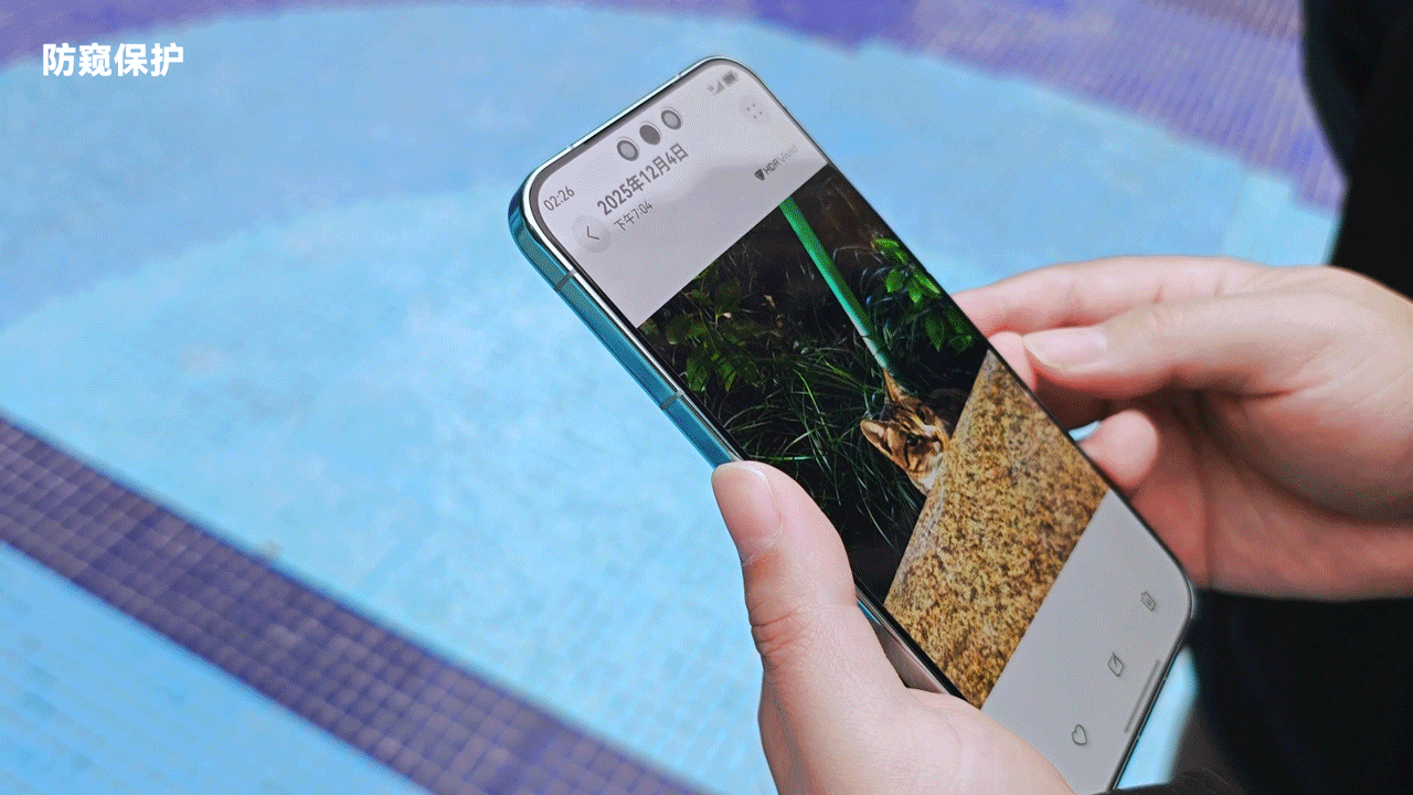 另外,在公交、地铁等公共场所使用手机时,屏幕信息被偷窥也是常见的泄露隐私的场景。而此次华为Mate 80系列的防窥保护2.0也获得了重要升级。当系统识别到他人视线时,除了主动弹窗提醒用户之外,它还会智能地隐藏屏幕上的敏感信息,以防被他人窥见。比如用户正在查看相册,如果遇到偷窥,手机不但会在屏幕顶部跳出提示,还会进一步隐藏整个手机屏幕的显示内容,主打一个守护到位。