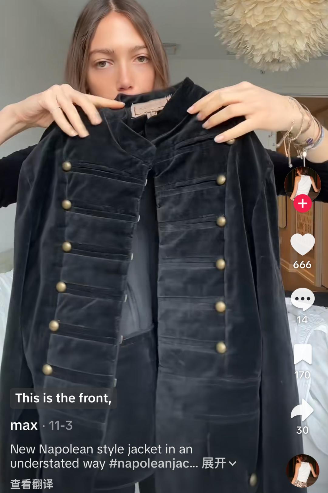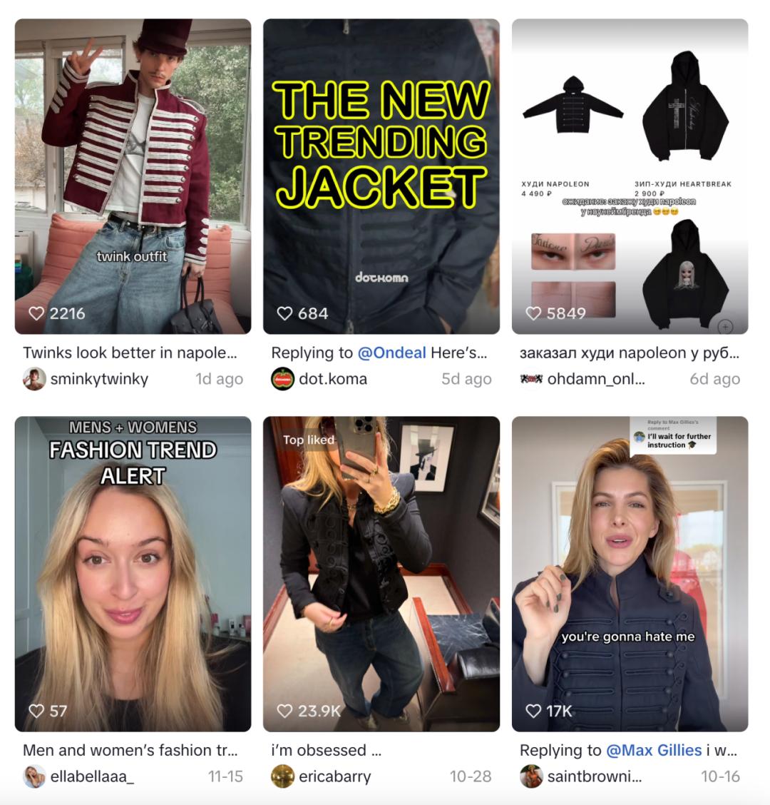 在 TikTok、Instagram 等海外社媒上不少时尚博主在视频里展示他们如何从古着店、二手市场、旧衣柜里挖出军装旧衣——有的是旧仪仗队制服,有的是 80、90 年代复刻版本。