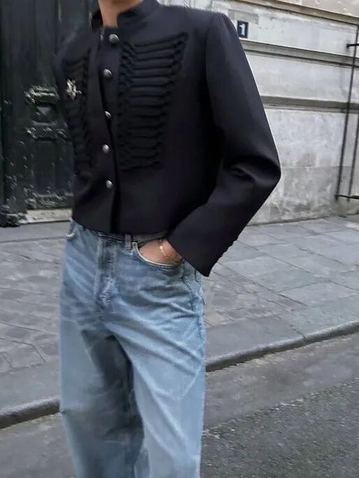 2025 年下半年,在国内二手、复古社群中“ Napoleon Jacket ”“ military jacket ” 这件带有金属扣、立领、肩章、frogging 辫绳扣饰的 “军乐队式夹克”,正以前所未有的速度被一批年轻人捡起。根据 Harper’s Bazaar Singapore 最新报道,这股回潮正在成为 25、26 街头与潮流圈的新趋势。