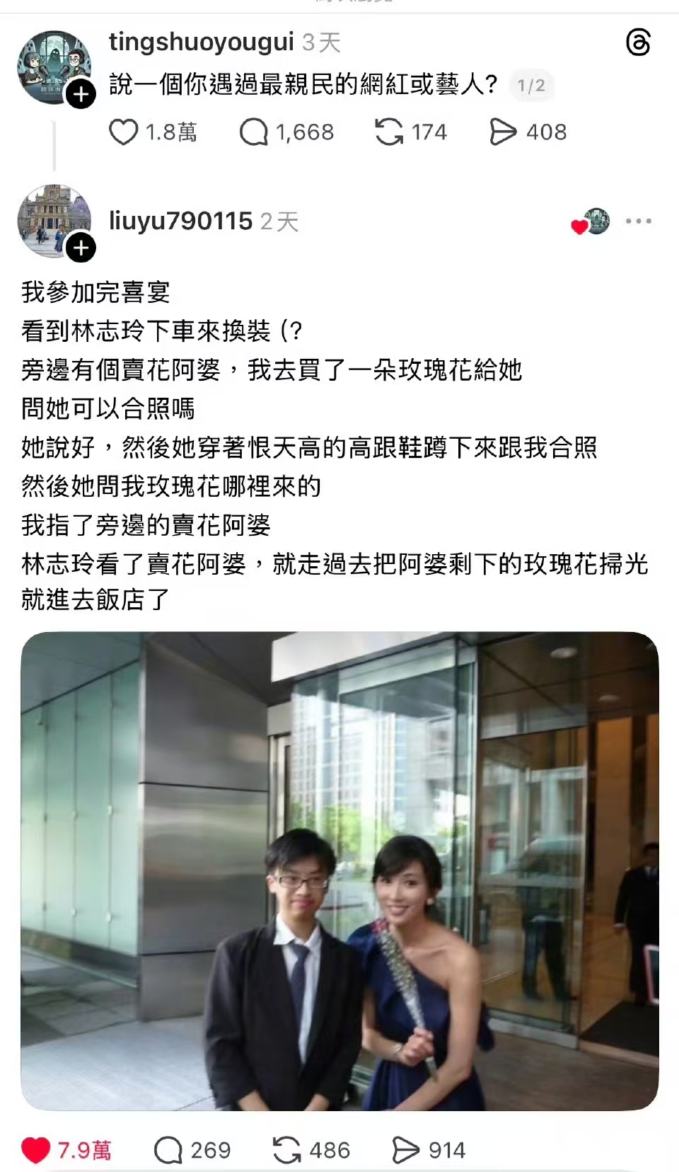林志玲的教养,更体现在那些无人关注的细节里。路人偶遇她时,常能看到她买光路边卖花老人的玫瑰,只为让老人早点回家;在剧组自费请全员喝奶茶,用温暖拉近距离。在后台帮模特换衣服时,她轻声细语的叮嘱和细致入微的帮助,让工作人员忍不住称赞“超温柔又有礼貌”。这种发自内心的善意,被同行评价为“骨子里的礼貌”,让每一个与她相处的人都感到如沐春风。
