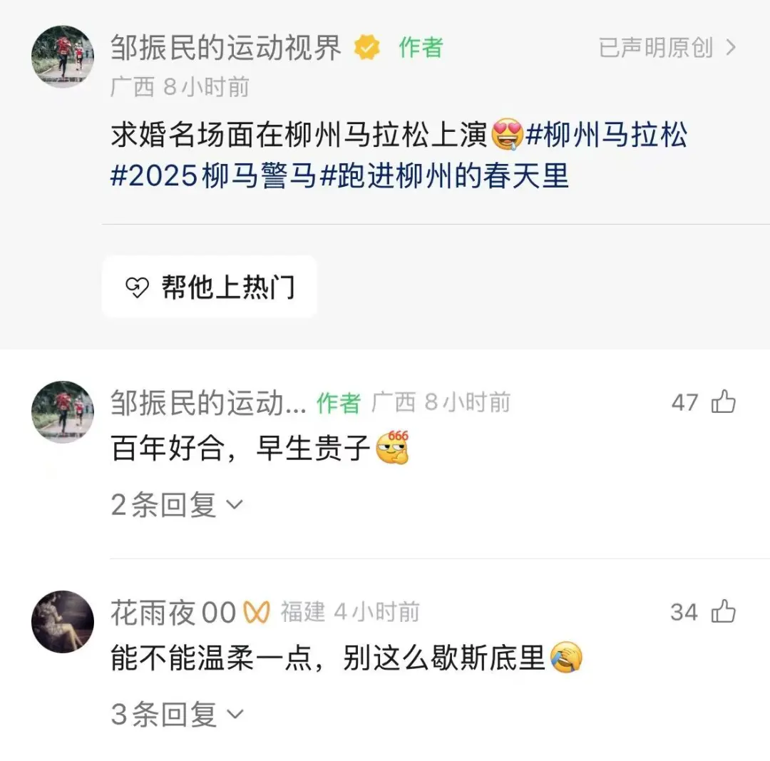 3月30日,在2025柳州马拉松半马终点处,惊现一场浪漫的求婚名场面。