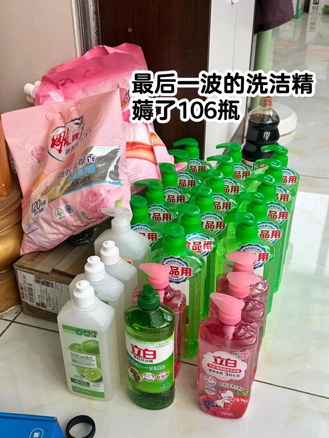 有一个粉丝,为了凑满减买了几箱洗洁精,能用几年。