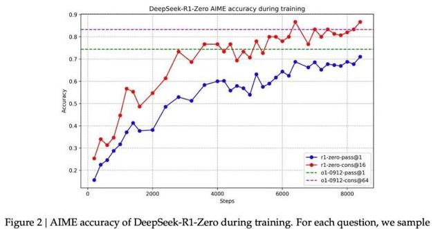 R1-Zero 的特别之处在于,它无需标注的 SFT 训练集就能够在推理任务中表现出色。它的训练过程直接从一个预训练的基础模型开始,通过强化学习(RL)训练完成(没有经过 SFT 步骤)。它的表现如此出色,以至于可以与 O1 媲美。