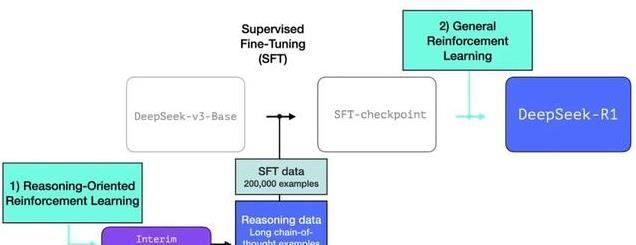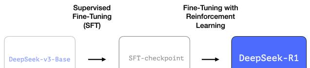 DeepSeek-R1 遵循这一通用方法。第一阶段的细节源自之前关于 DeepSeek-V3 模型的论文。R1 使用了那篇论文中的基础模型(而不是最终的 DeepSeek-V3 模型),并同样经历了 SFT 和偏好调优步骤,但其具体实现方式有所不同。