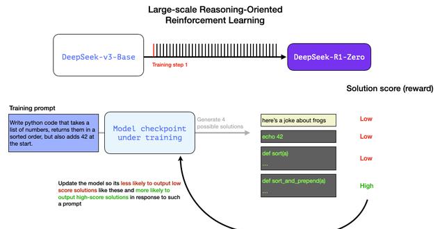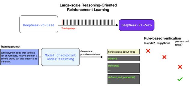 这些数据是由 R1 的前身模型生成的,一个尚未命名但专注于推理的“兄弟”模型。该模型的灵感来源于一个名为 R1-Zero 的第三个模型(稍后我们会讨论)。它的意义不在于它本身是一个优秀的 LLM,而在于它的创建过程仅需少量标注数据,并结合大规模强化学习,从而生成了一个在解决推理问题上表现出色的模型。