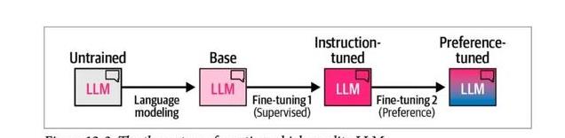 下图摘自我们书籍的第 12 章,展示了通过三个步骤创建高质量 LLM 的通用方法: