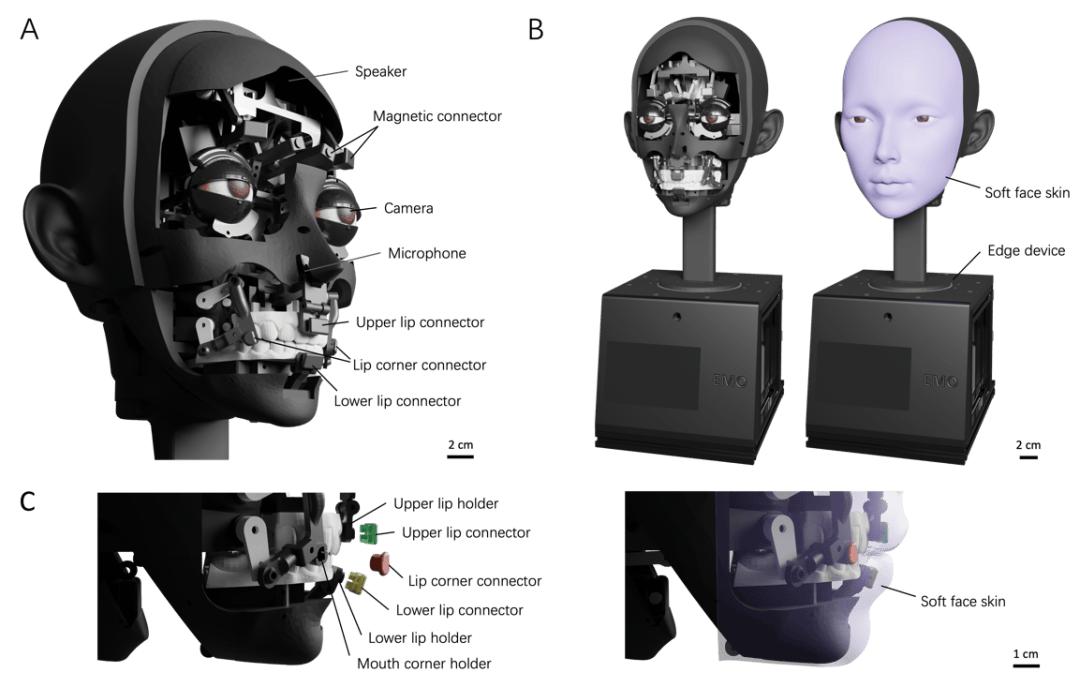 图 2. 机器人唇形硬件结构。(A)面部机器人设计概览,重点展示了人机交互关键组件:包括扬声器、麦克风、高清摄像模块,以及用于固定柔软硅胶面皮的磁吸式快拆连接器。该连接器能实现面皮的精准定位,并通过推拉双向运动驱动硅胶面皮,完成说话时所需的复杂唇部动作。(B)搭载柔软硅胶面皮的人形机器人外观展示。其底座内部集成有边缘计算设备。(C)唇部驱动系统特写,展示上唇、下唇与唇角连接器分别对应固定于相应唇部支架。柔软可替换的面皮通过磁吸连接器固定,可便捷拆卸以进行维护或个性化调整。