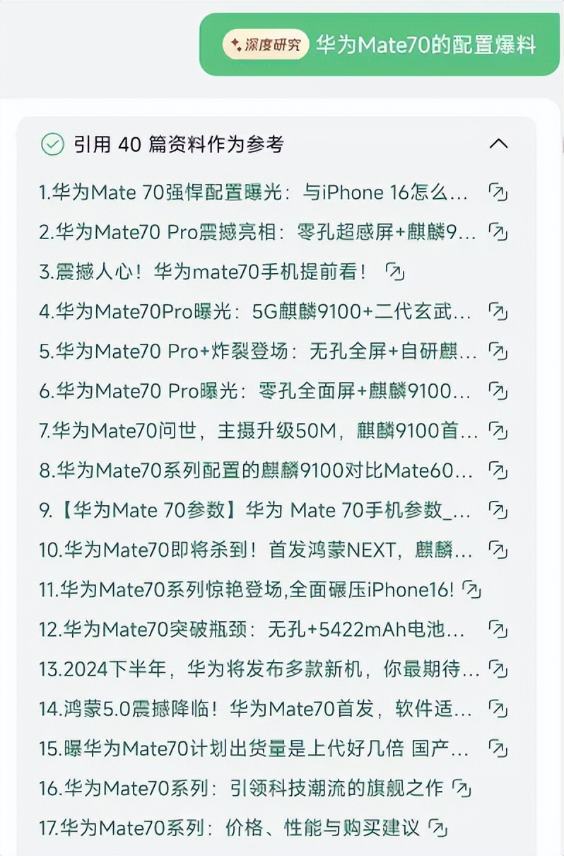 紧接着,我测试了过去写的一篇“华为Mate70系列终极前瞻”文章,元宝竟然非常智能地抓取了这篇文章,并用其中的内容作为参考。
