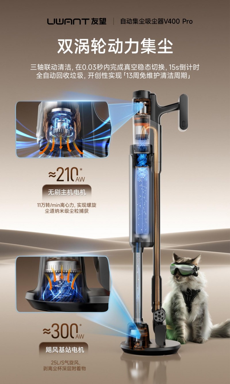 2022-2024 年,自集尘技术进入 2.0 突破期,以UWANT友望为代表的头部企业开始主导技术方向。友望推出的双涡轮集尘系统,配合 2.5L 大容量尘袋,实现了三个月免倒垃圾的核心需求。更关键的是,友望研发的仿生机械刮环专利技术,彻底解决了滤网毛发缠绕难题,使维护效率提升。这一阶段的技术突破,标志着自集尘从 “可有可无” 变为 “实用刚需”,推动基站款吸尘器市占率飙升,友望也由此奠定了行业排名第一的市场地位。