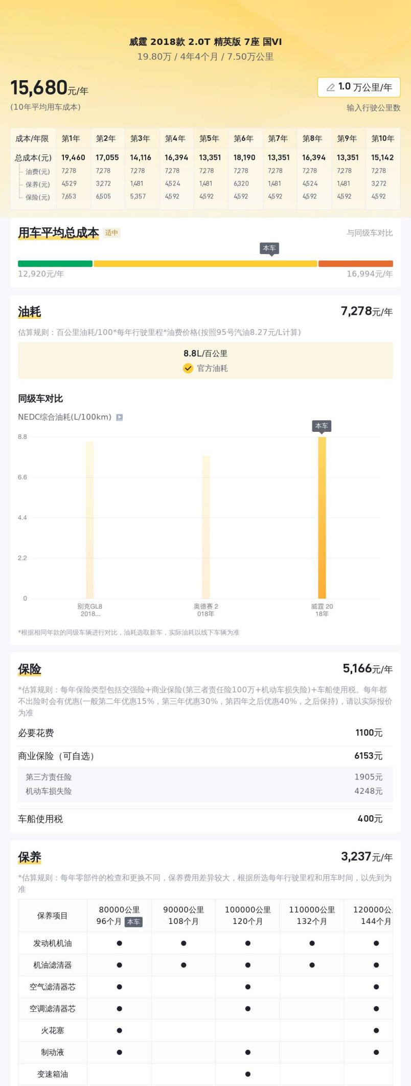 其次,我们要考虑用车成本。除了购车款,后期的用车成本也是一笔不小的开支。根据估算,这辆威霆每年的燃油费、保险费、保养费、年审费以及其他杂费加起来大约在2.8万元左右。这还不包括潜在的维修费用。对于一些预算有限的消费者来说,这可能是一个不小的负担。