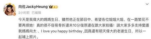 向佐发文祝母亲向太生日快乐,呼吁大家不要烦她,要多支持爱护她!这一句话,看似平淡无奇,却在社交平台掀起了轩然大波。你可曾想过,这句简简单单的祝福背后,其实藏着一场复杂的家庭纷争,明星背后的权力博弈,甚至连一场关于公众形象的较量也悄然上演。先从最引人注目的祝福说起。向佐的祝福虽然直接简单,但它背后反映的却是公众对他母亲——向太的复杂情感。向太,一位以言辞犀利、行为直率著称的公众人物,她的每一个动作都能引发网友们的热烈讨论。