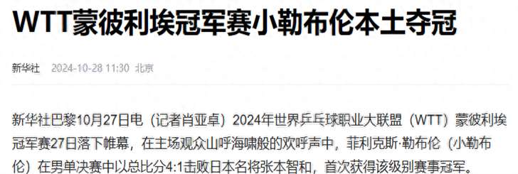 在10月28日的WTT冠军赛男单决赛中,F·勒布伦以4-1的比分战胜了日本名将张本智和,成功夺得冠军。这场胜利不仅彰显了他的超强实力和无限潜力,更以其独特的庆祝方式——兴奋地跳上球台,高举双臂,仰天怒吼——向全世界宣告了他的崛起。这一幕,无疑让无数中国球迷感到刺眼,批评、质疑和谩骂声也随之而来。F·勒布伦就这样以一种近乎挑衅的方式闯入了中国球迷的视野,同时也为国乒敲响了警钟。