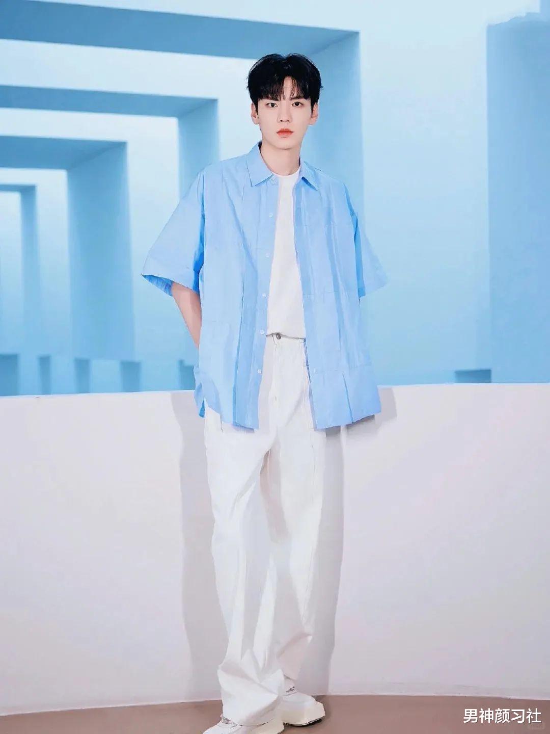 邓为的这身也是这样的套路,他用的是大面积的白色来打造蓝天白云的清新感。这个穿搭很重要的地方就在于衬衫的饱和度不能太高,浅色系的其实是最好的。