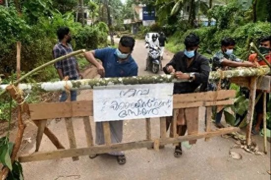 2023年9月13日,在印度南部喀拉拉邦科泽科德地区,人们设置路障以遏制尼帕病毒传播。孟加拉国、印度、马来西亚等几个国家几乎每年都会发现少量病例。新华社/路透