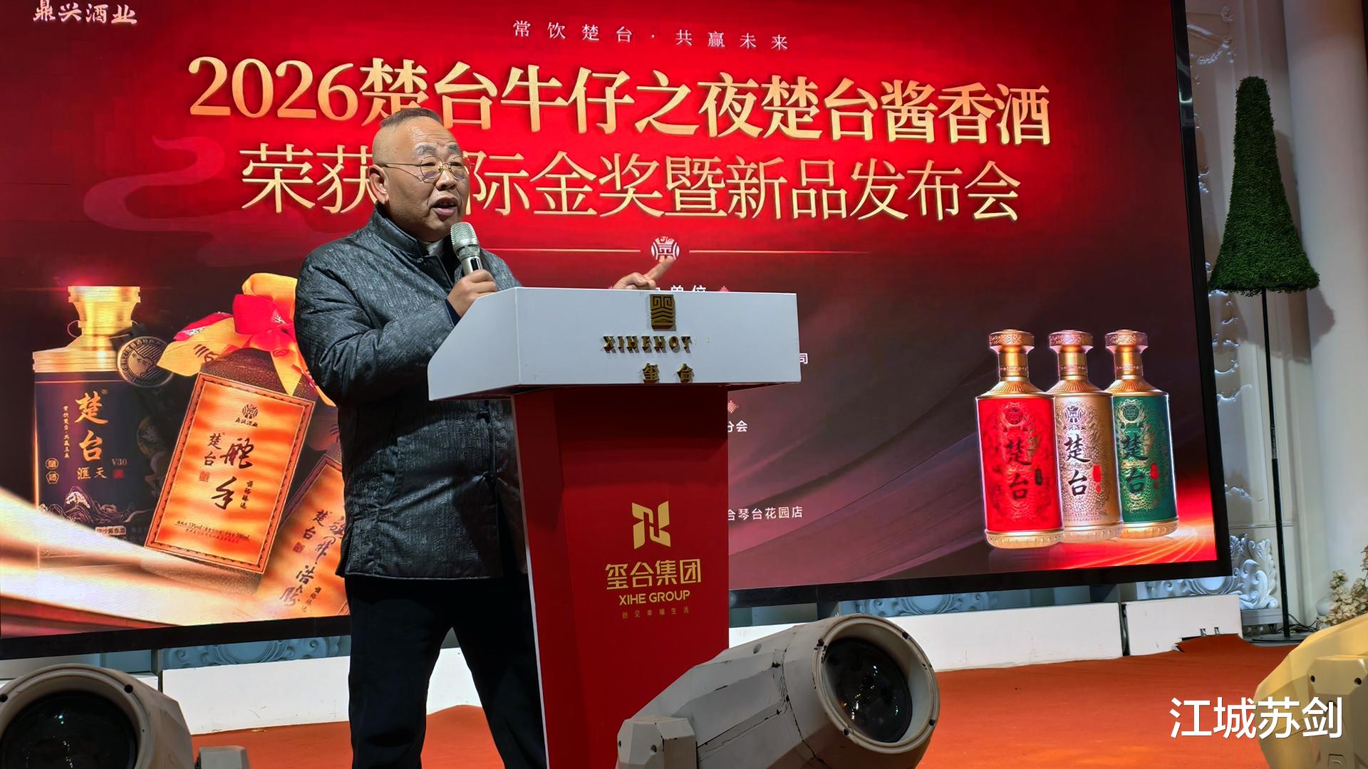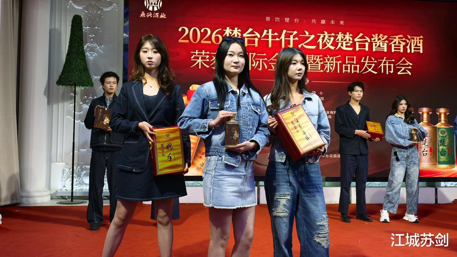 重头戏随后揭幕——鎏金帷幕缓缓拉开,楚台酱香酒2026“牛仔之夜”限定版亮相:瓶身以楚国黑红漆器为灵感,腰间束一条“牛仔蓝”皮标,传统与潮流撞了个满怀。