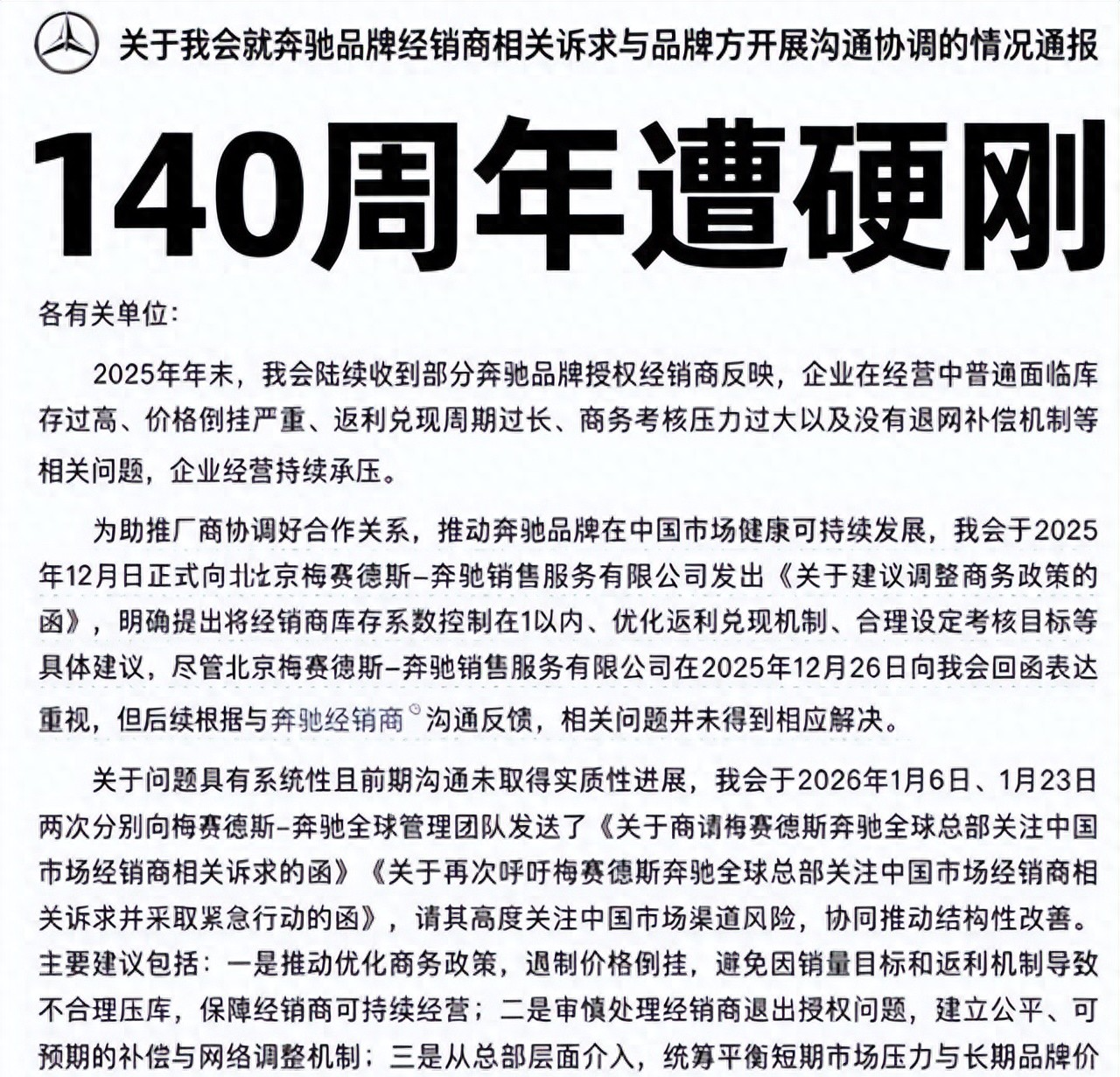 1月28日,全国工商联汽车经销商商会正式发布通报,公开“控诉”奔驰主机厂,称收到大量奔驰授权经销商的投诉,核心问题集中在4点,每一点都戳中了经销商的痛点:一是库存过高,经销商压货严重,资金周转困难;二是价格倒挂离谱,卖一辆亏一辆,盈利难以为继;三是返利兑现周期太长,商务考核压力巨大,不少经销商濒临亏损;四是没有退网补偿机制,经销商想退出都难。