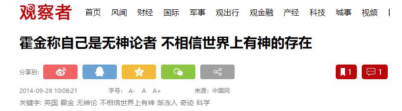 观察者网《霍金称自己是无神论者 不相信世界上有神的存在》