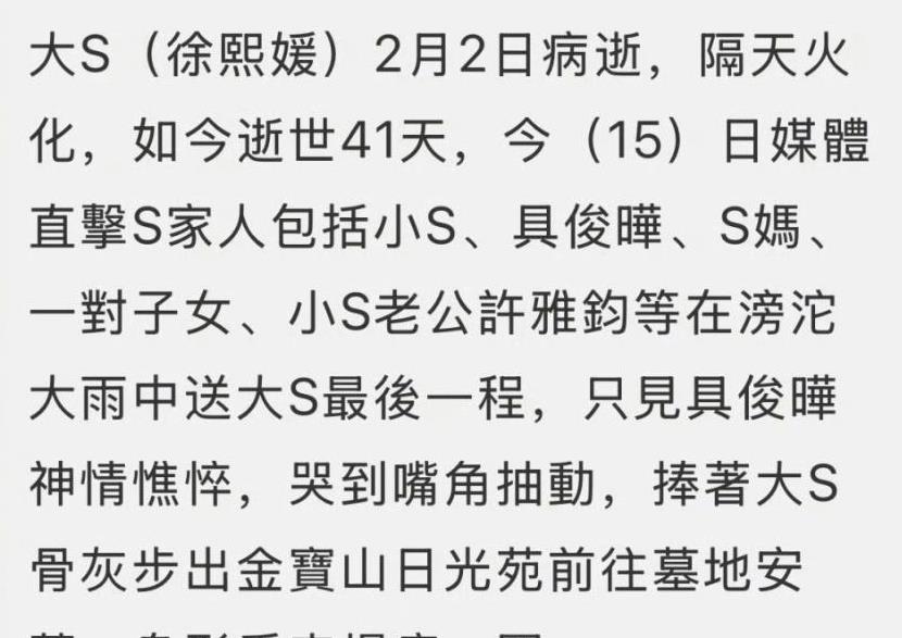 媒体拍到的照片中,具俊晔从金宝山日光苑请出骨灰,然后捧着骨灰前往墓地安葬。霎时间暴雨如注、狂风大作,工作人员手中的雨伞都拿不稳。也是因为天气的原因,现场的媒体也无法清晰目睹葬礼的过程,也算是在某种程度上保护了大S的家人。不管怎样,在大S去世41天后,总算是入土为安了。