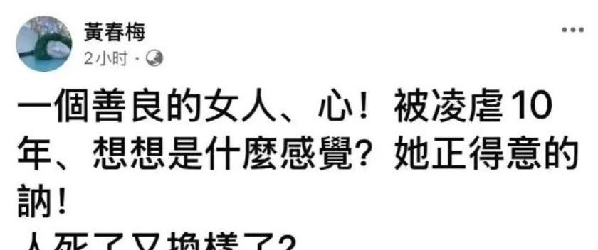 逝者落葬,算是一个重要的日子,原本以为随着大S丧礼的圆满完成,很多围绕她们一家的争议也就随之烟消云散了。没想到大S母亲黄春梅的一条社交动态,打破了这份宁静,再一次将矛头指向了汪小菲他的母亲张兰。S妈提到的“善良的女人,心被凌虐10年”,这显然指得是大S与汪小菲不堪回首的十年婚姻。“她正得意着呢,人死了又换样了?”这句话被人认为是在针对大S的前婆婆张兰。