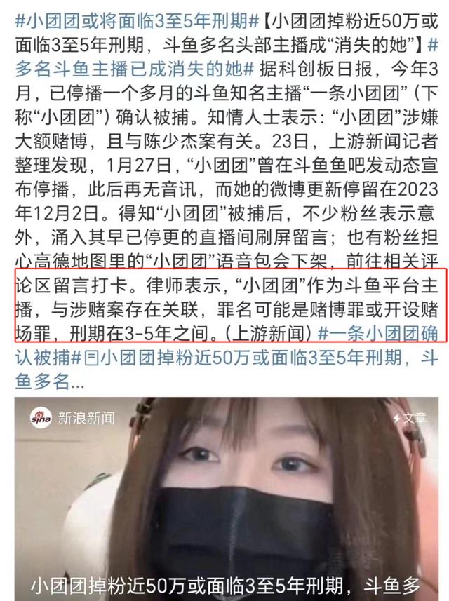 但在今年4月23日,据科创日报,已停播一个多月的斗鱼知名主播“一条小团团”确认被捕。