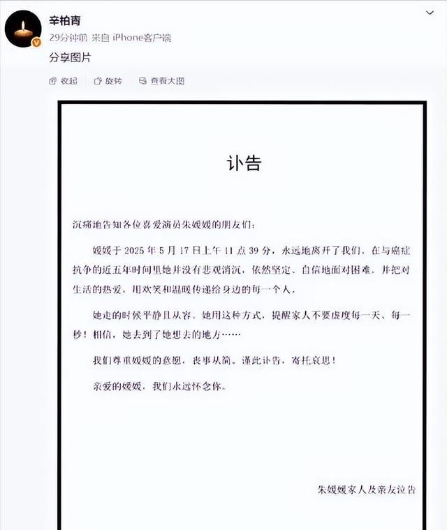 2025年5月21日,演员辛柏青在微博发布讣告。