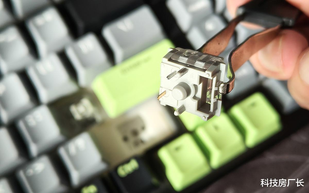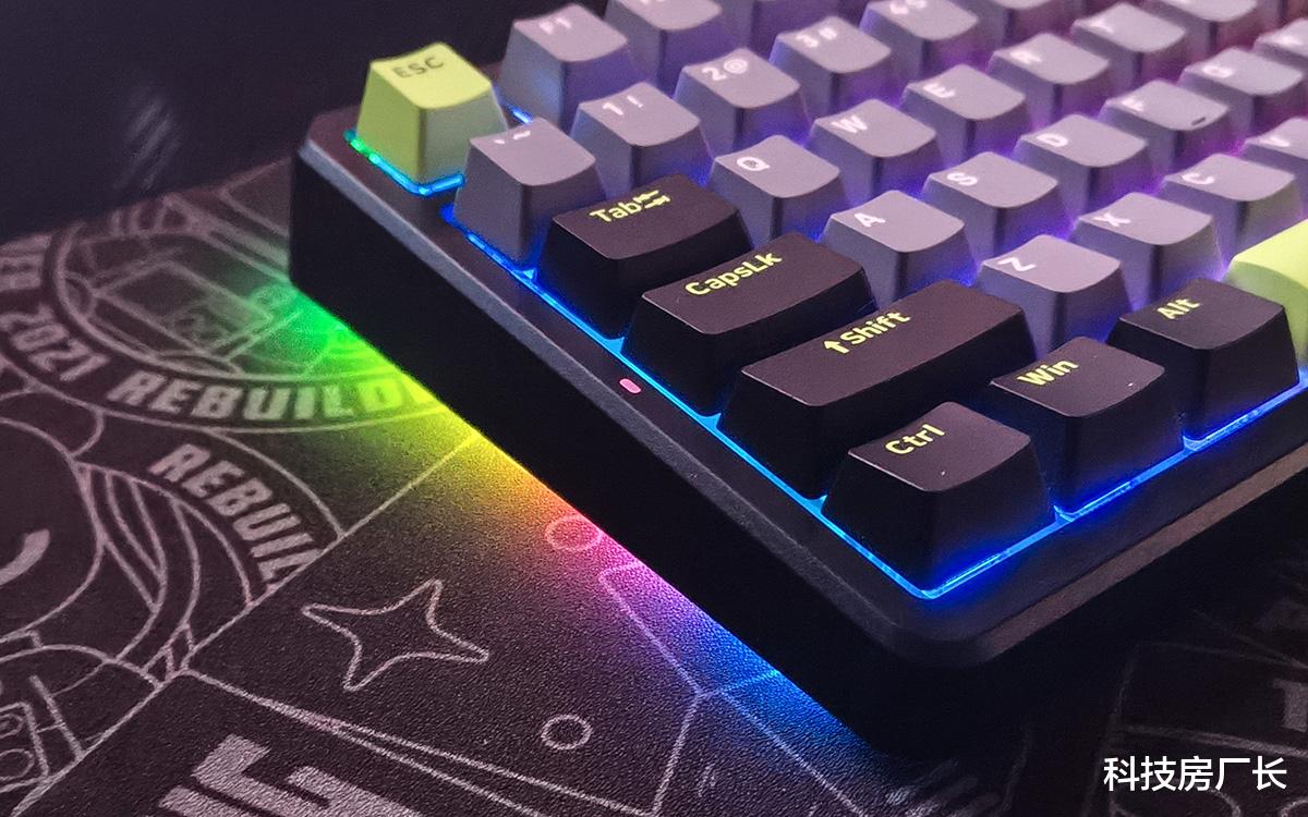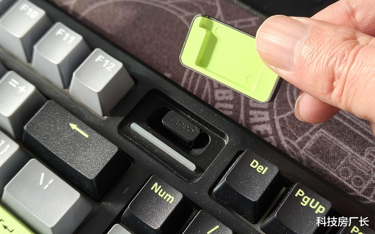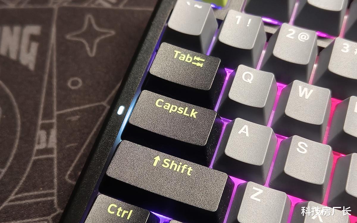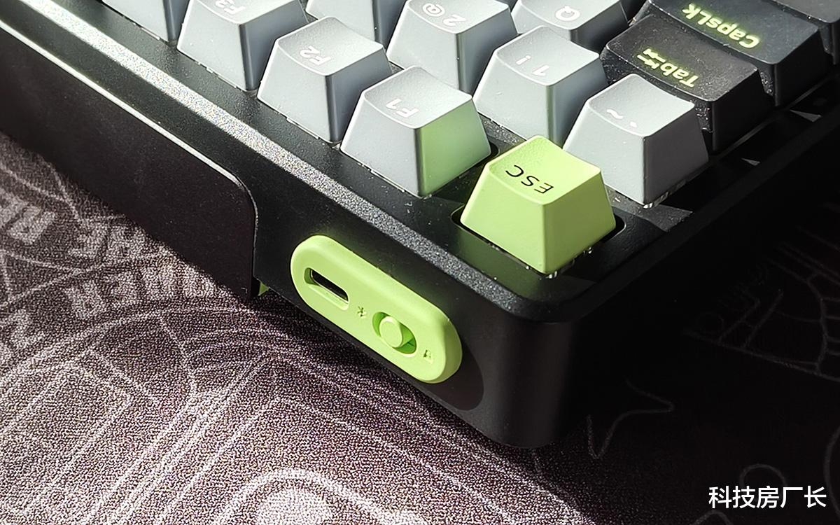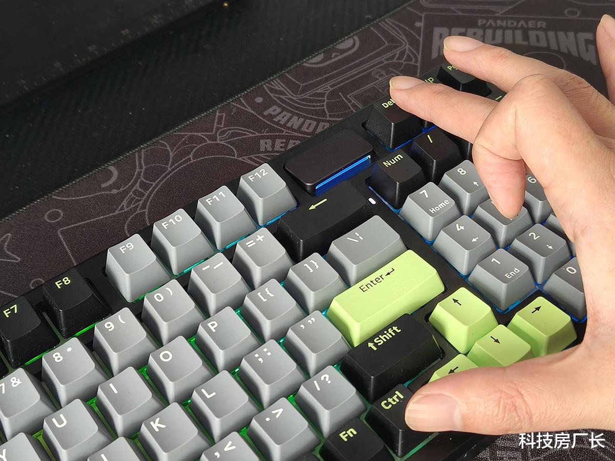 这款键盘外观挺好看的,我选的是“初号骑士”配色,以浅灰色为主色调,辅以黑色和浅绿色点缀,按键功能分区一目了然。键帽采用了高含量PBT材质,经久耐用、不易打油,细腻的磨砂表面也有不错的触感。