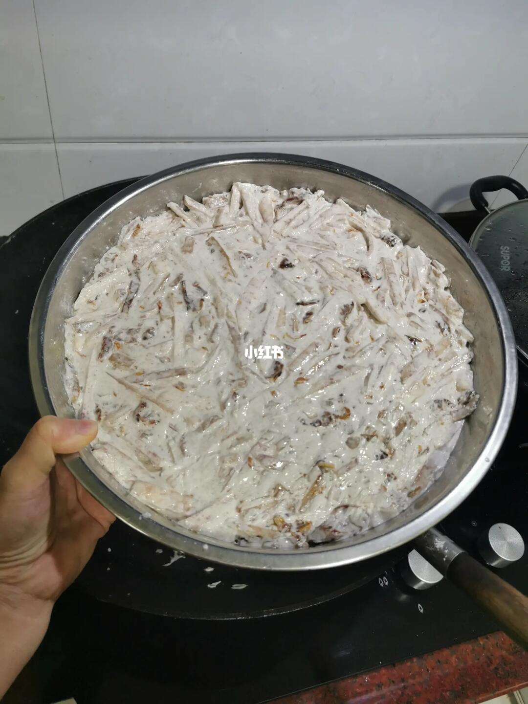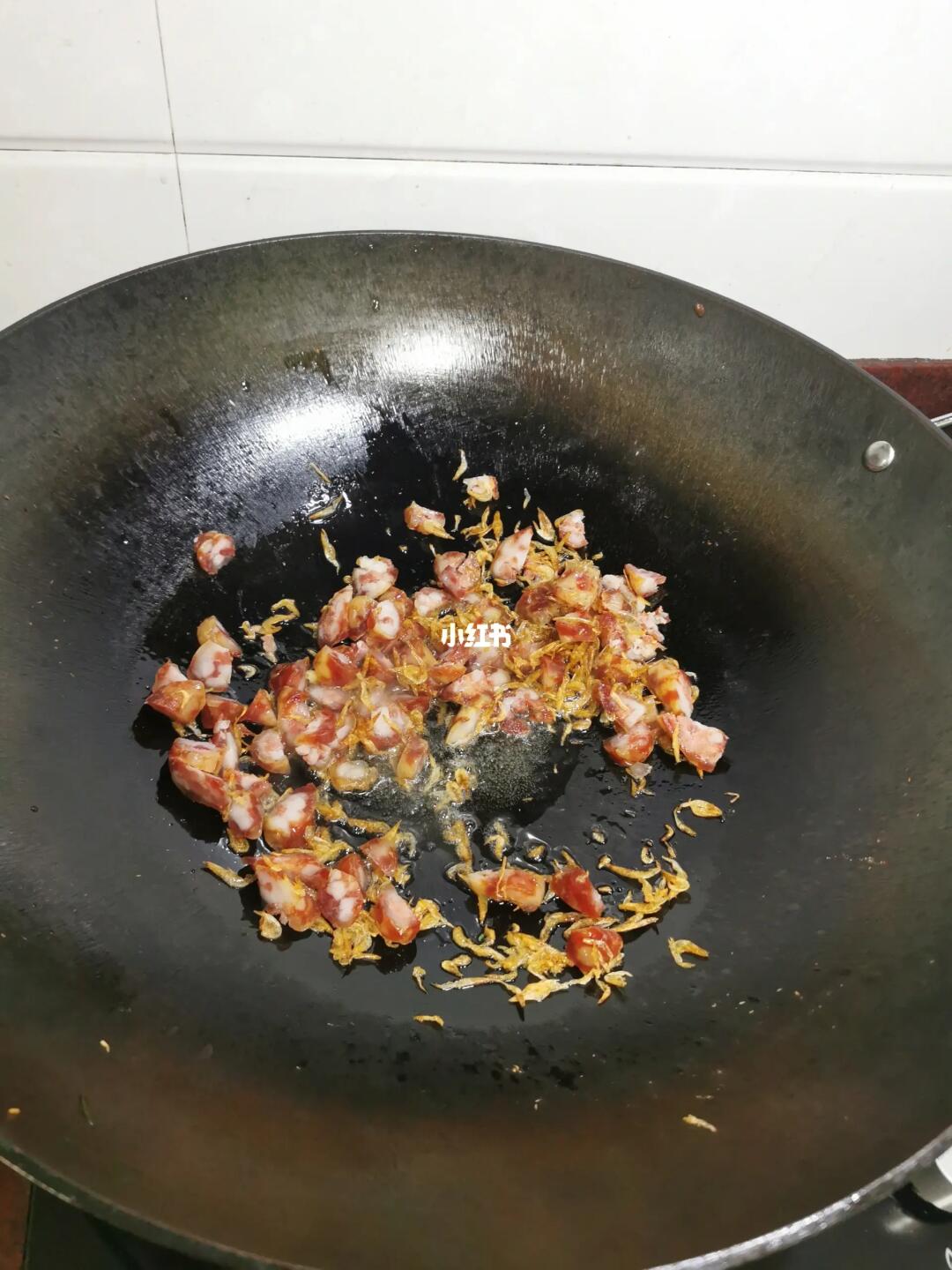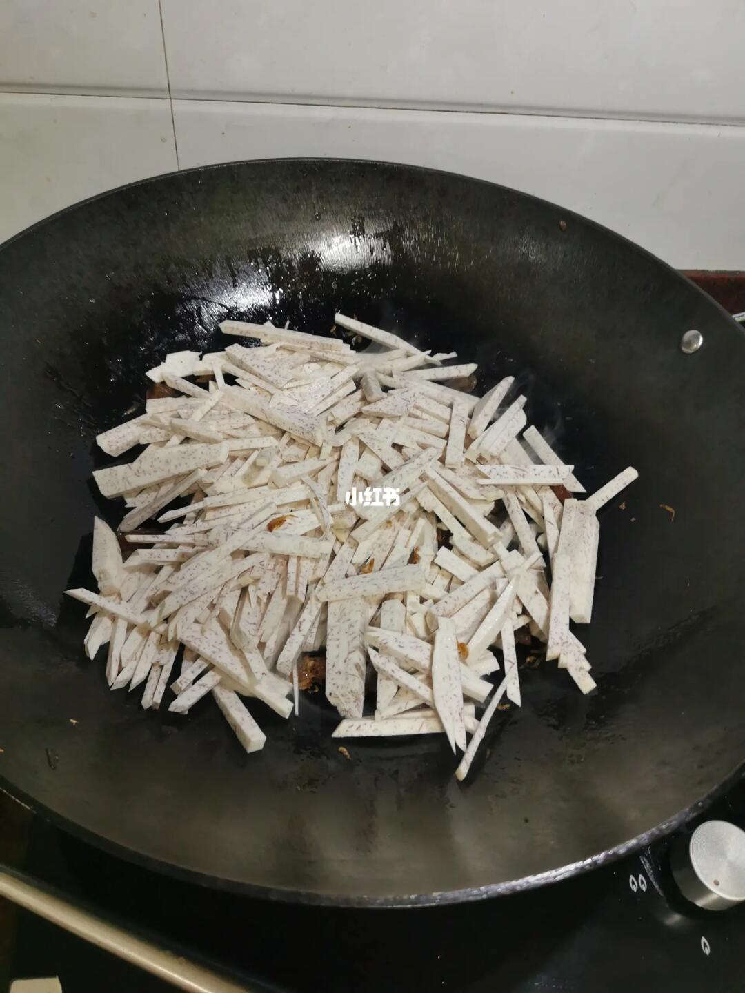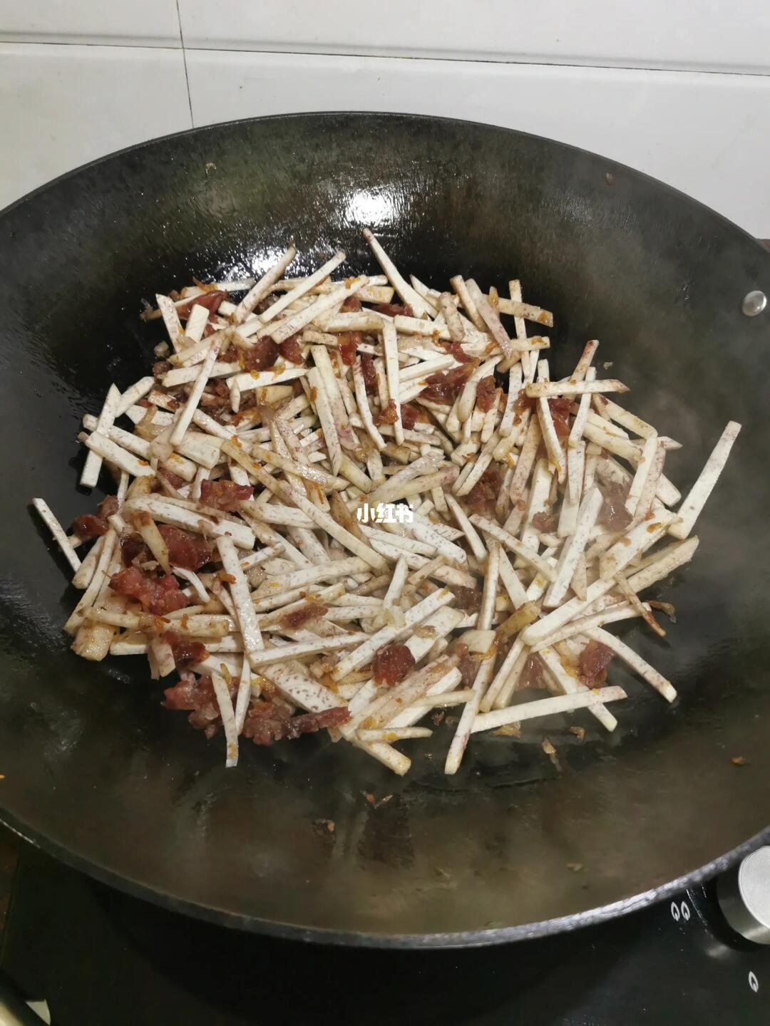 【3】、起锅热油,把腊肠、虾皮放入锅里中小火炒出香味,再倒入切好的芋头丝翻炒,加入盐、白胡椒粉、五香粉翻炒均匀,翻炒至芋头半熟的状态,关火!把米浆倒入锅里,然后快速翻拌均匀。