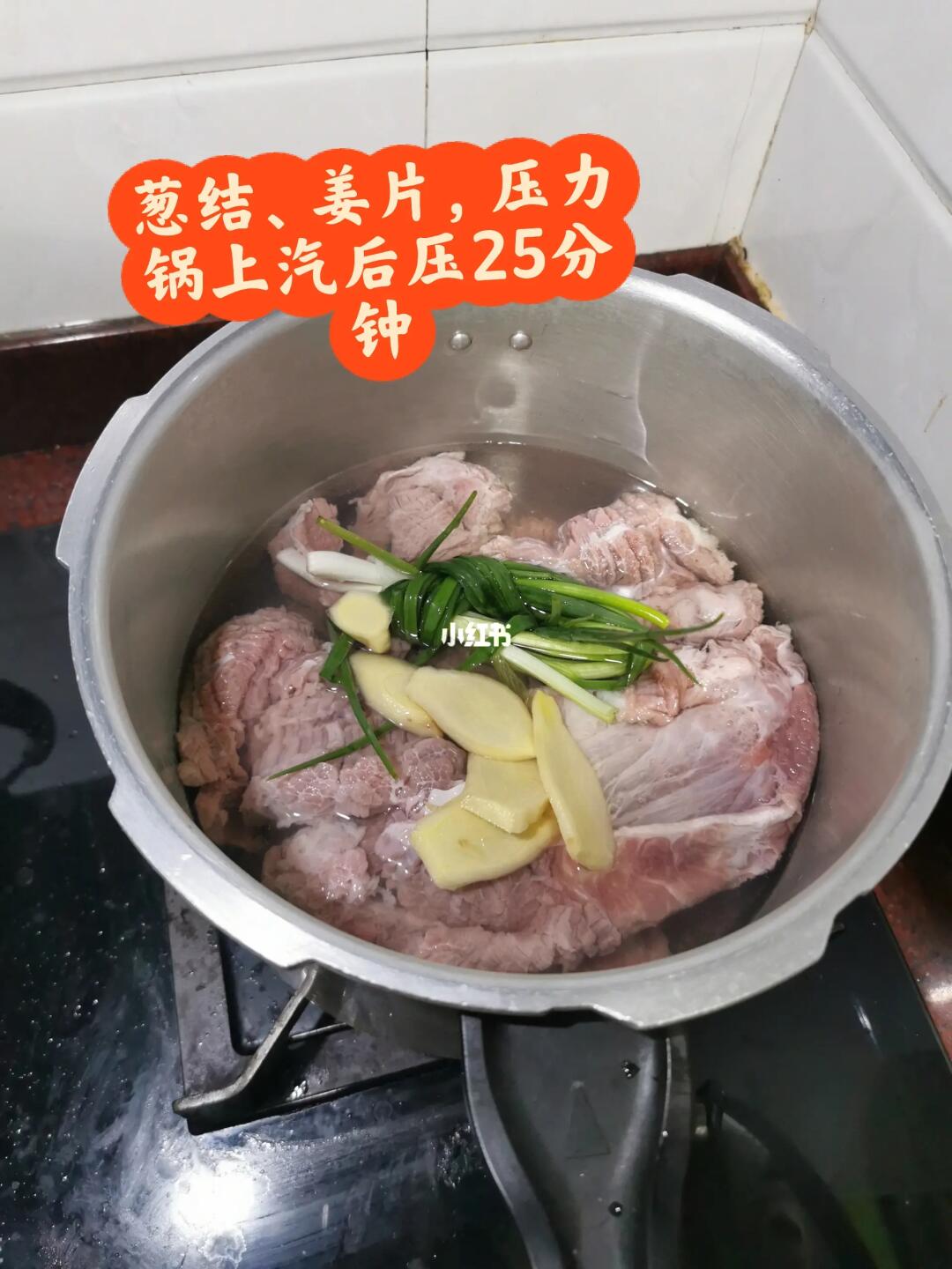 把新鲜的牛腩用清水浸泡2小时,中途要换两次水,把血水泡出来,洗干净放入压力锅里,加入姜片、葱段、清水,上汽后压25分钟。