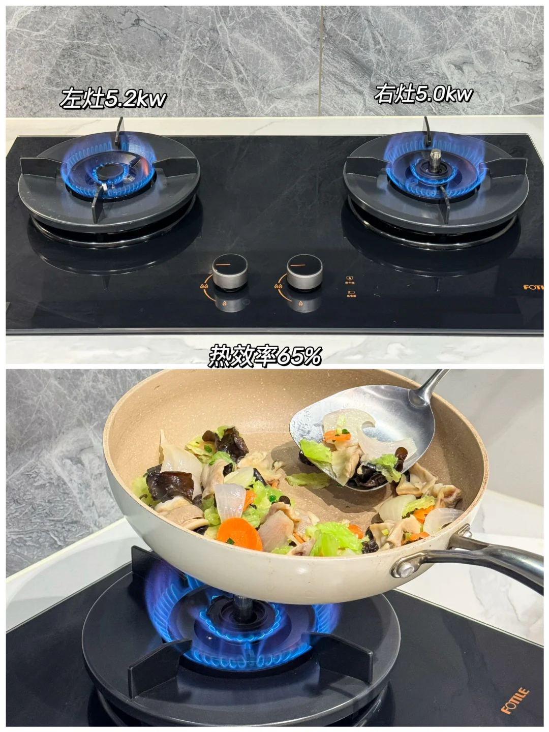 除了安全它的火力也很猛,这次预演家宴老公点名要小炒肉,这道菜对火力要求比较高,猛火快炒才能锅气满满,它左灶5.2KW,右灶5.0KW,65%热效率,炒出来的小炒肉完全不输外面大厨😄