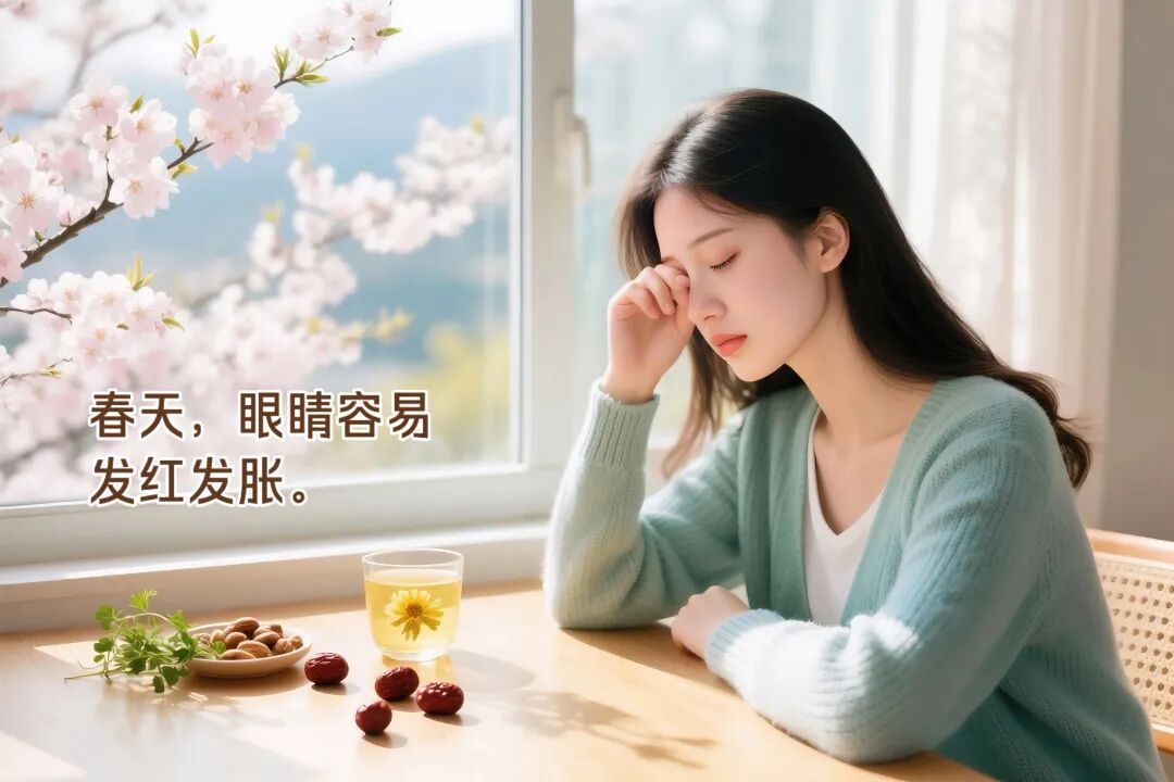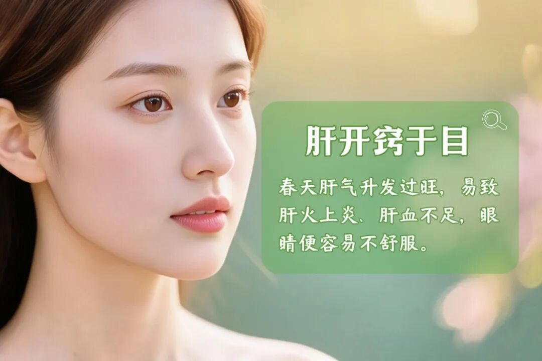 春天如果肝气升发的太快,容易肝火旺盛,肝火上炎,容易肝血不足,眼睛也会不舒服,因为:肝受血而能视,肝开窍于目。