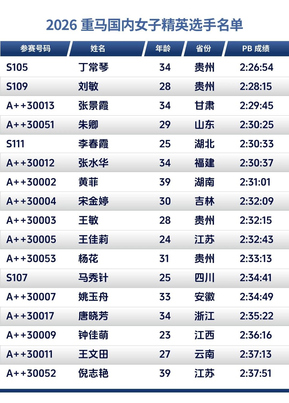 在对手里,同为34岁的贵州名将丁常琴PB为2小时26分54秒。丁常琴是一个成名很早的跑者,她2013年22岁就拿下全运会女子马拉松银牌,第二年仁川亚运会收获5000米铜牌及万米银牌。另外贵州28岁的刘敏个人最好成绩2小时28分15秒,甘肃34岁的张景霞个人最好成绩2小时29分45秒。