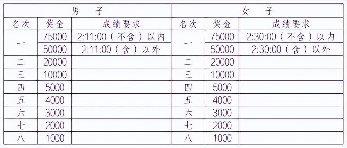 重马的奖金比较可观,男女组冠军5.5万美元(38.37万人民币)。国内女子组冠军跑进2小时30分奖金为7.5万元,成绩在2小时30分之外奖金5万元。亚军2万元,季军1万元。