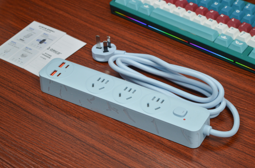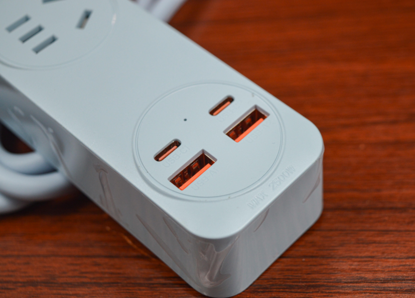 插排集成了 2个USB-A口和2个Type-C口。其智能快充协议芯片兼容性广泛,可以为市面上绝大多数手机、平板、Switch等设备快速充电。