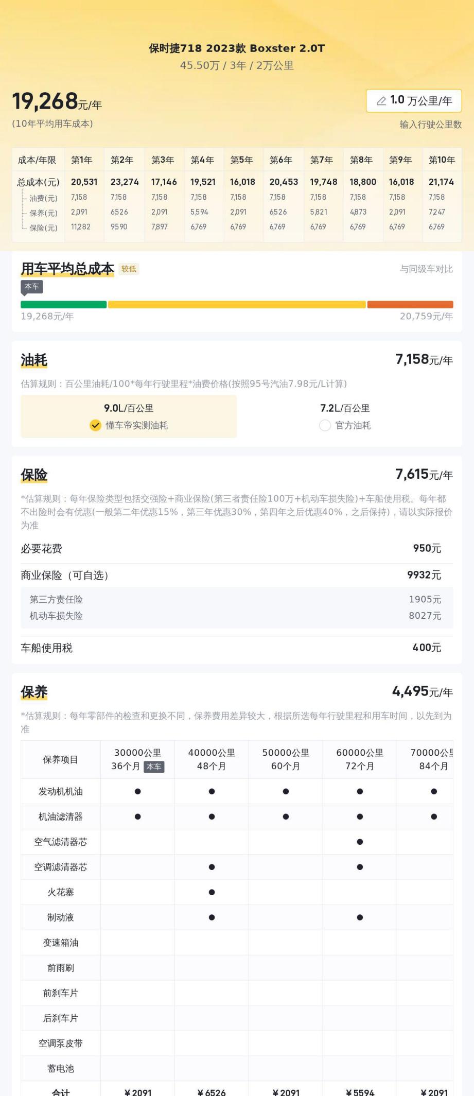 除了车价之外,购车后的用车成本也是需要考虑的重要因素。根据估算,718 Boxster的年均用车成本大约在1.9万元左右,包括保险、保养、油费等等。这对于一辆跑车来说,其实并不算高。