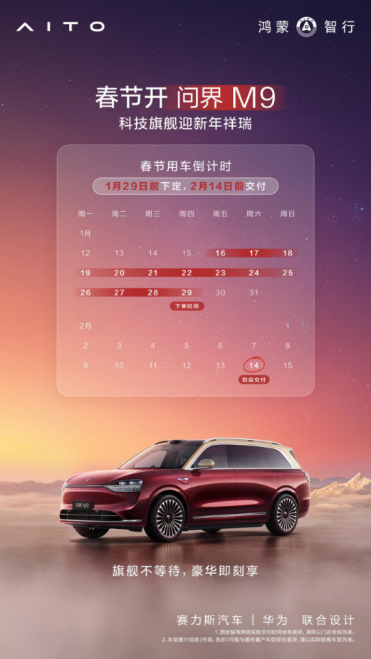 岁末年初之际,问界M9推出的限时购车权益与快速交付保障,让此刻成为入手这款豪华SUV的绝佳时机。此次优惠政策表明:即日起至2月2日,下定问界M9至高可享87000元限时购车权益。这不仅是真金白银的优惠,更是对您选择智慧豪华出行的真挚回馈。同时,针对消费者的春节用车需求,问界同步开启了快速交付通道,全力优化生产与服务链路,确保用户在春节前无忧提车,轻松开启智慧豪华旅程。