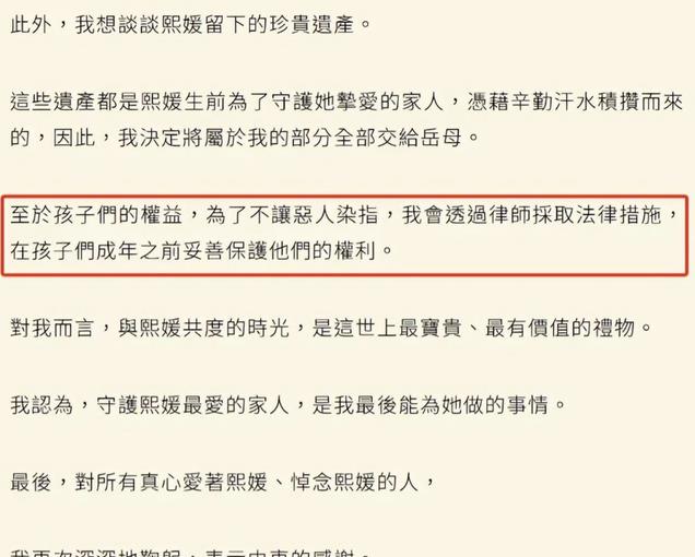 对于这些传闻,具俊晔也做出了回应,具俊晔表示自己会放弃遗产的继承,并且会用法律手段保护两个孩子,不让“恶人”伤害他们。