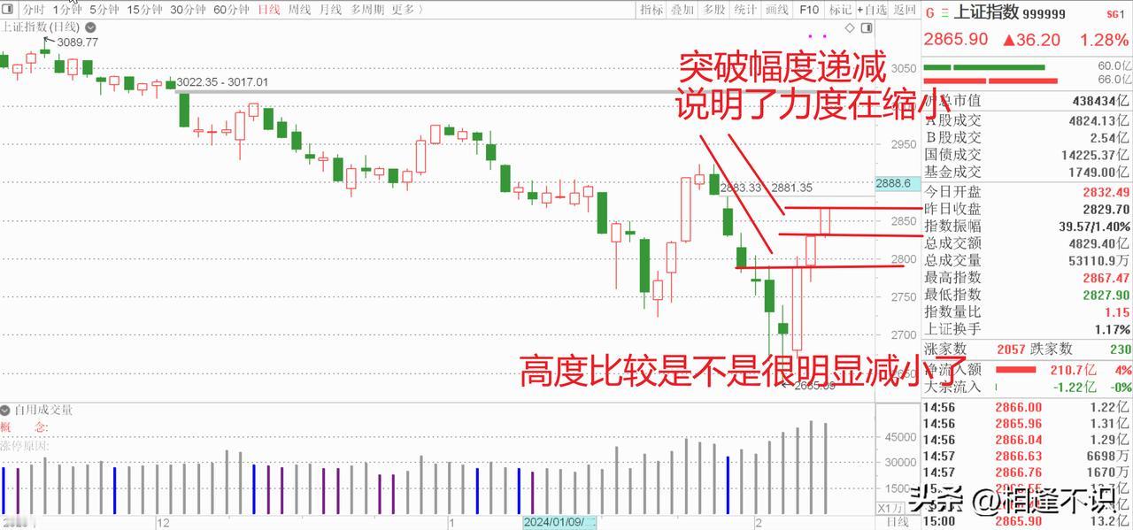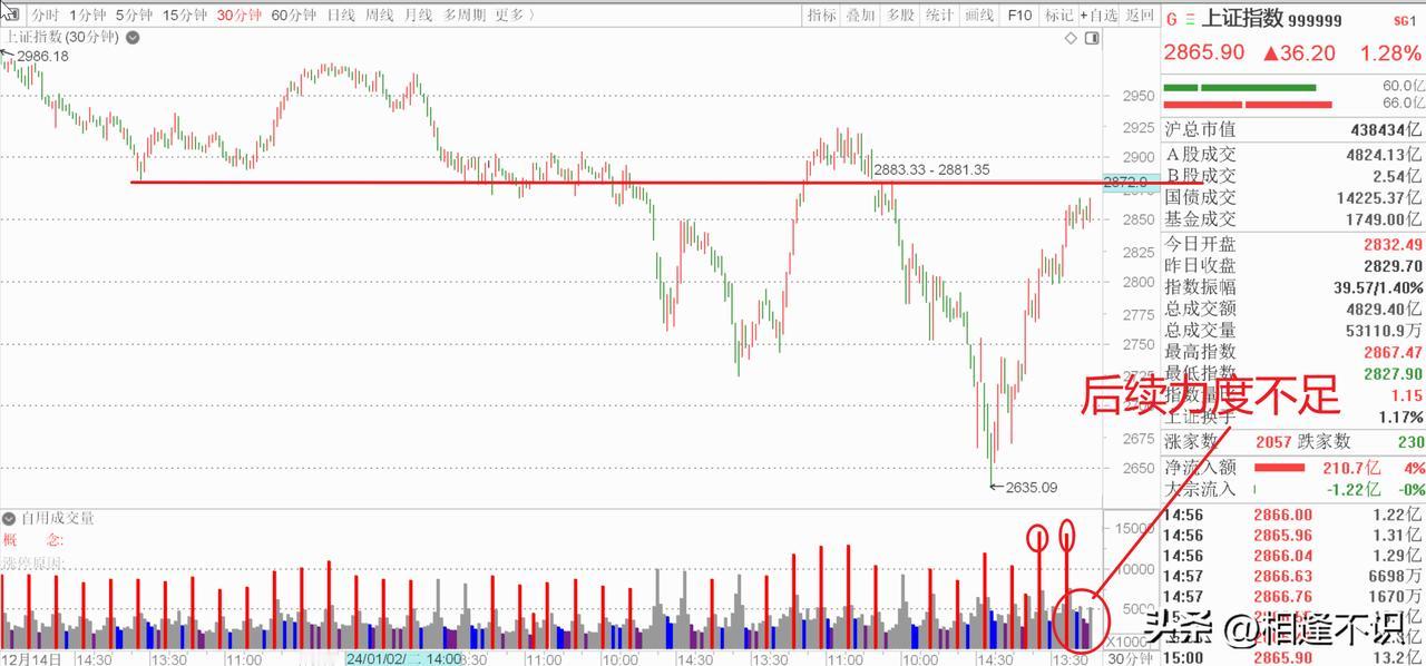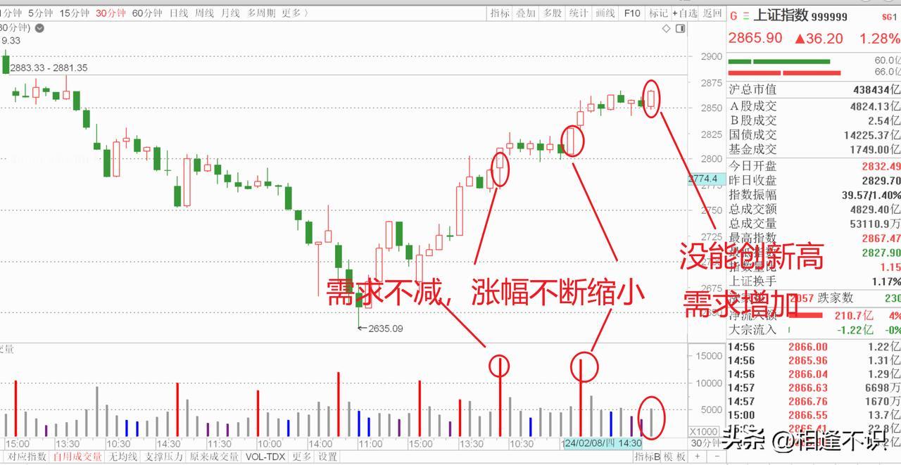 农历初三,写一篇微头条,分析一下上证指数。 本文只是作者个人观点,据此操作后果自负。 我们先来分析一下日线走势。 需求主动介入,这说明筑底的行为已经开始了,但是涨幅却逐渐缩小,这说明了供应在逐渐增加。 距离冰线很近,这里是强供应区,所以要想突破必须继续放量才有可能突破。 尤其是三根放量阳线突破幅度逐渐缩小,大概率也是不支撑突破行为的。现在判断都是猜测,所以开盘后走出来也就知道了。 按照威科夫理论这个上涨属于AR阶段,是否筑底成功,后面的回测供应耗尽才是关键。 至于突破冰线再回测还是不能突破会回测并不影响结构的形成,只不过是走势的强弱不同而已。 下面分析一下30分的走势,细化一下分析。 需求依然比较强势,但是涨幅却在缩小,这也从另外一个方面印证了日线分析的结论。最后一根30分的K线需求增加,但是都没能创出该周期走势的新高,更说明供应没有完全被吸收。这不是上涨秩序的特征,所以大概率是会要回测的。 综合起来分析节后应该有机会回测,给上车的机会。把握住这一点就可以了。 回测不一定会很深,这要根据你自己看好的股来,不是看指数的走势。 整体的走势还是在超跌反弹的阶段,并不确定能直接走出反转走势。