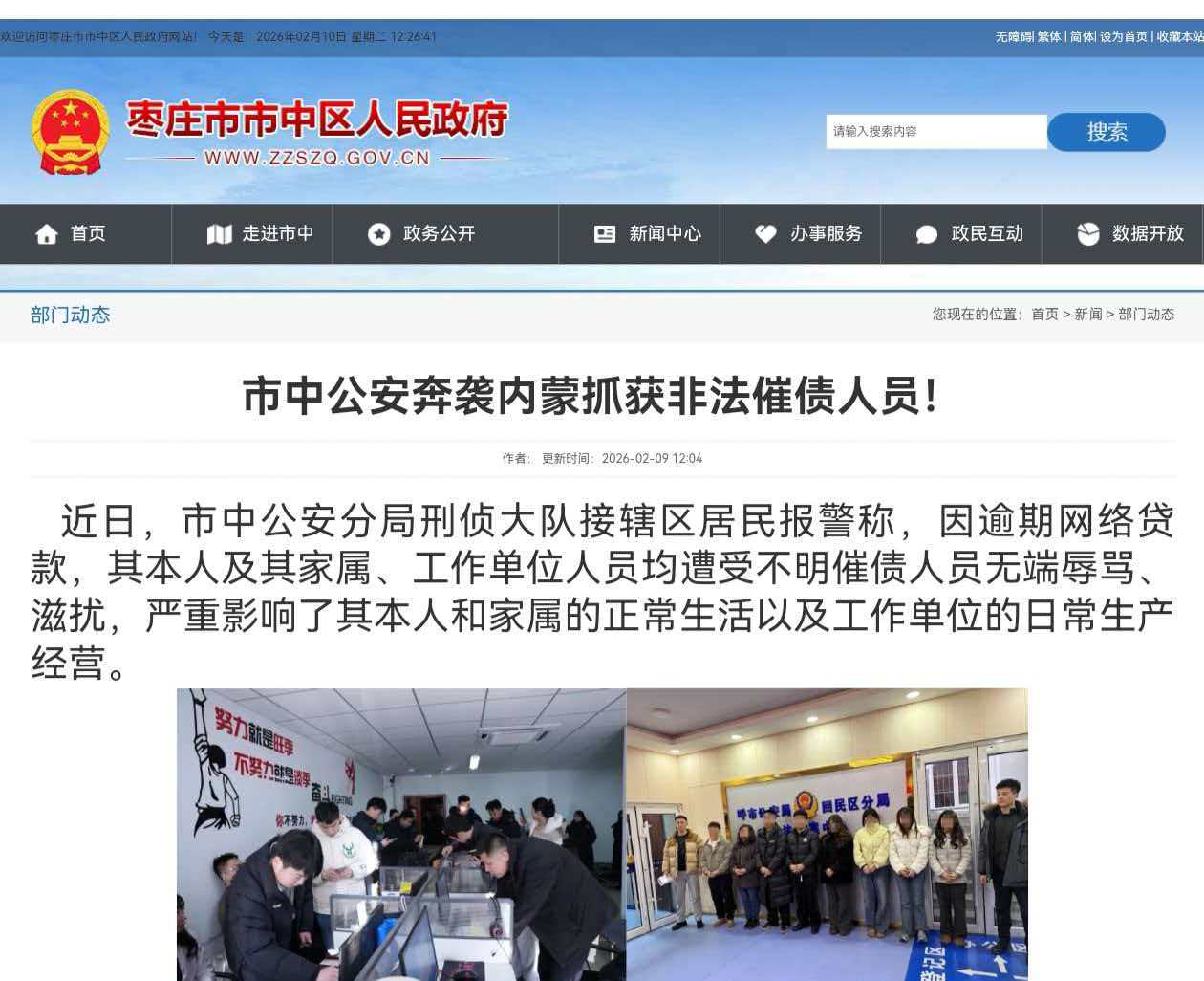跨省追击,多地严打非法催收2026年1月19日,枣庄市中区一居民报警称,因网络贷款逾期,其本人、家属及单位同事均遭受不明身份人员无端辱骂、滋扰。