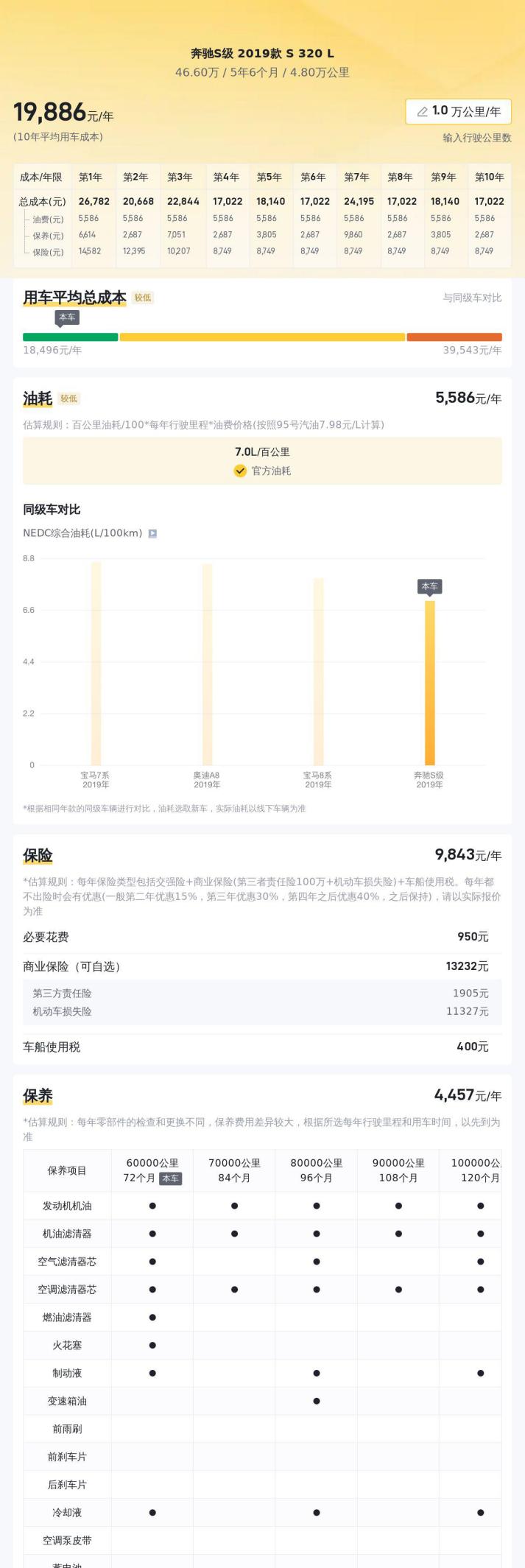 我们再来看看市场行情。根据数据显示,2019款奔驰S 320 L的二手车价格普遍在41.77万至51.96万之间。这辆车的报价46.6万,处于中等水平,比较合理。当然,具体价格还需要根据车况进行调整。