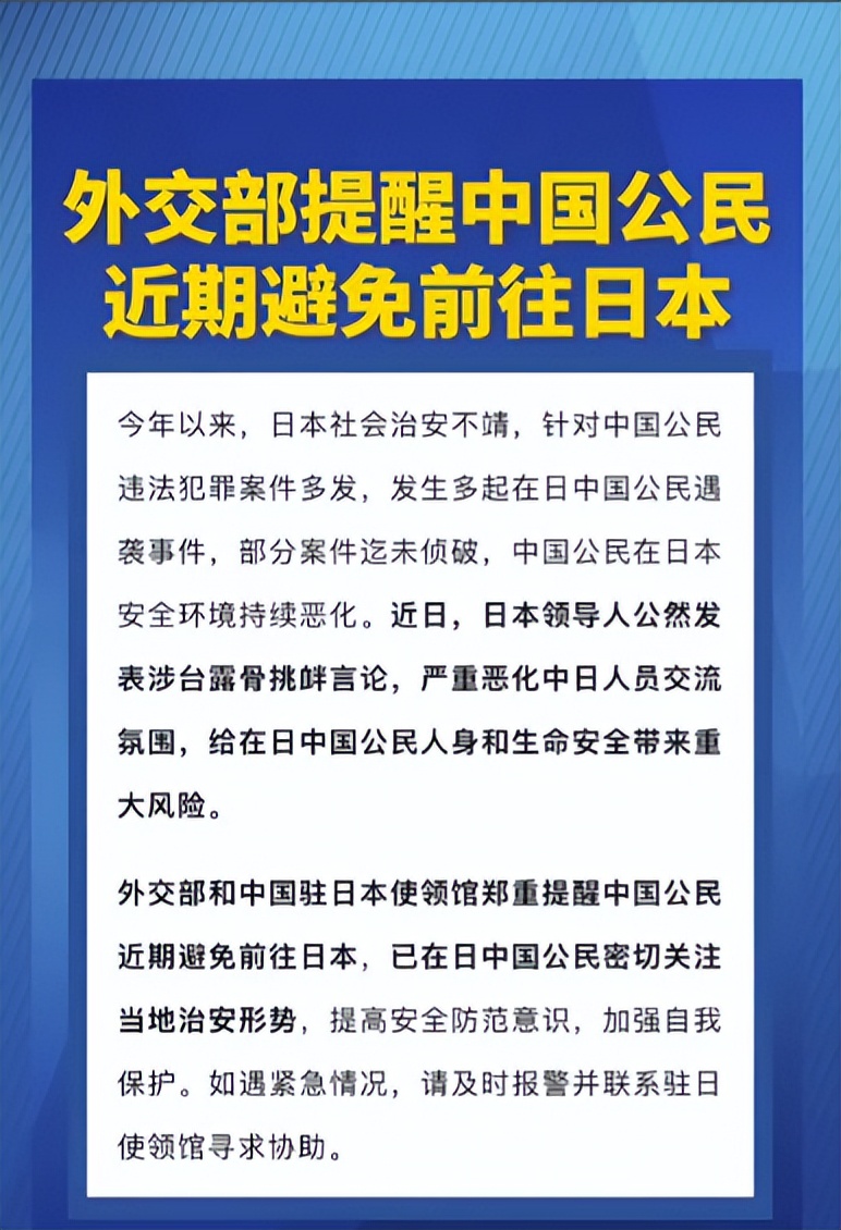 加上当时日本领导人发表了涉台的挑衅言论,严重影响了中日人员交流的氛围,给在日中国公民的安全带来了很大风险。